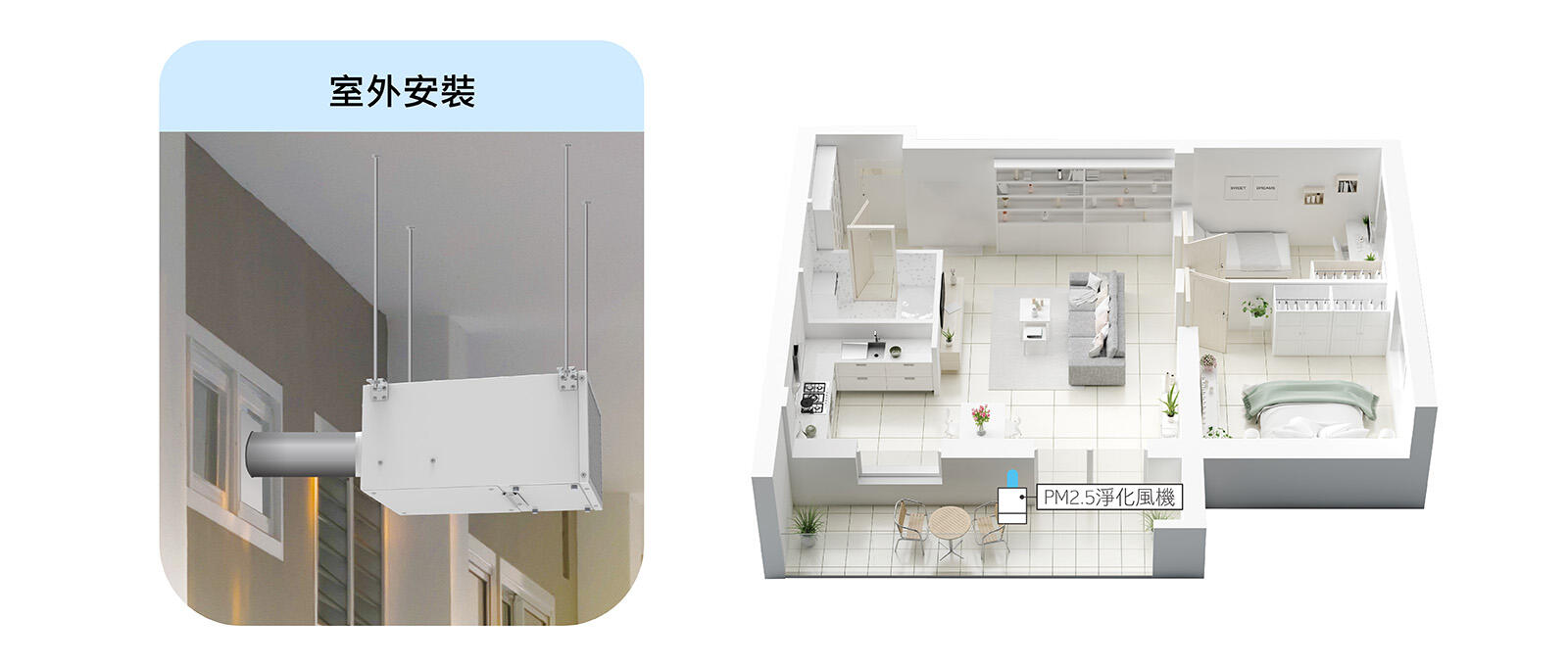 機身安裝於室外,使用最低極限風管配置,本體嚴選不鏽鋼材質+白色烤漆,防風防雨超耐銹。