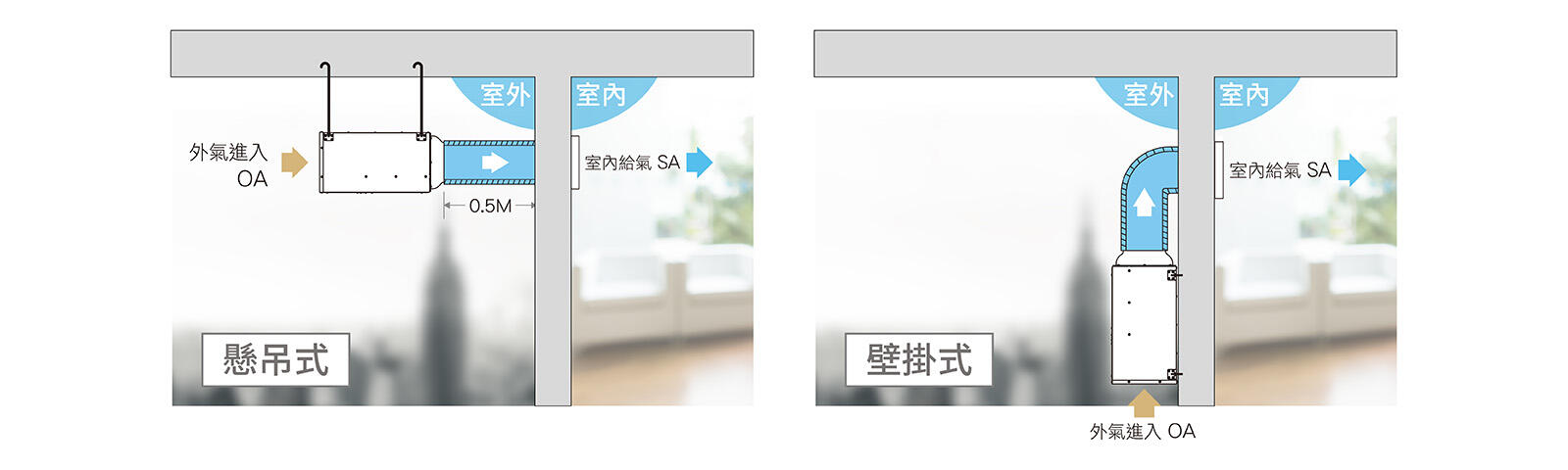 室外機可做 懸吊式 、壁掛式 兩種安裝