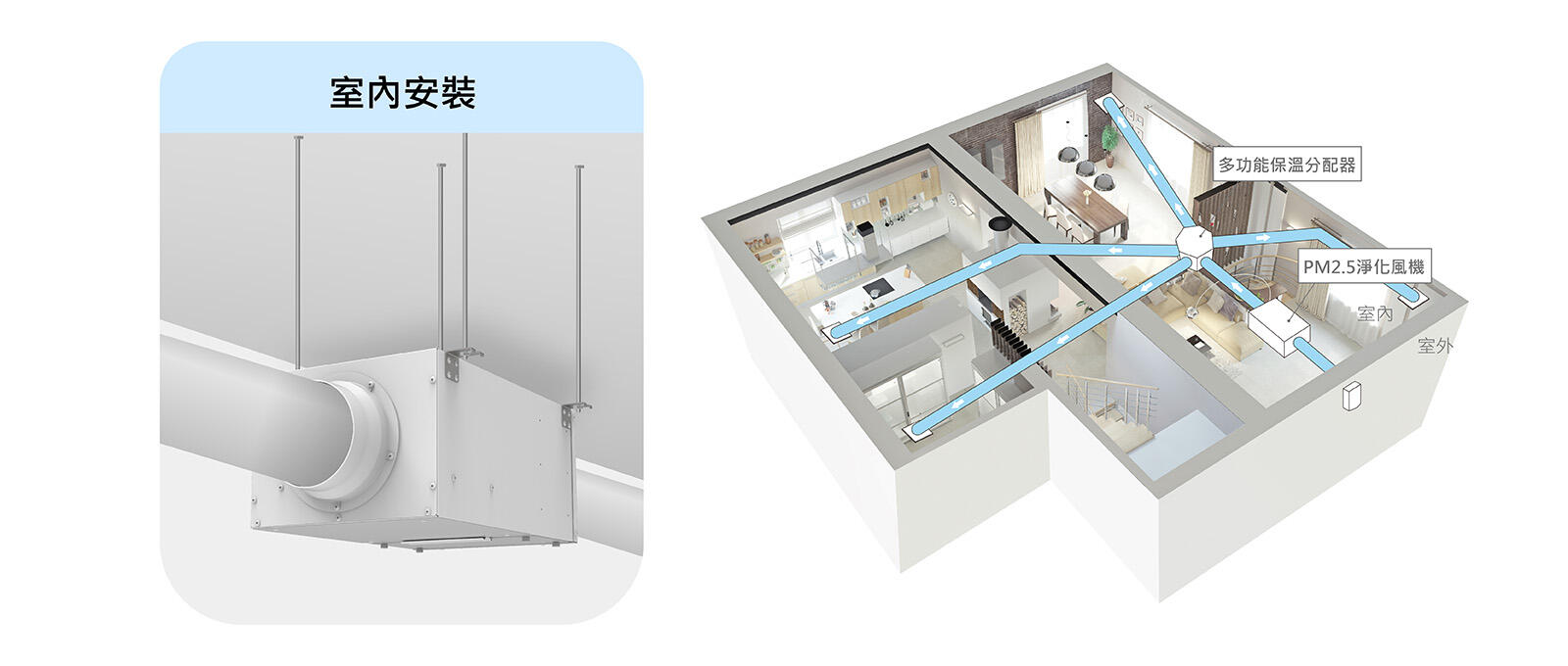 機身安裝於室內天花板,可靈活選擇位置安裝不受限,並能自由分配風管數量讓每個空間都能享受到新鮮空氣。