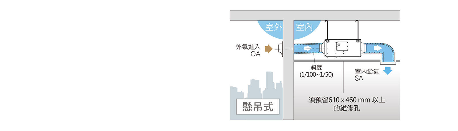 ※天花板須預留邊長全為 610 x 460mm 以上的維修孔